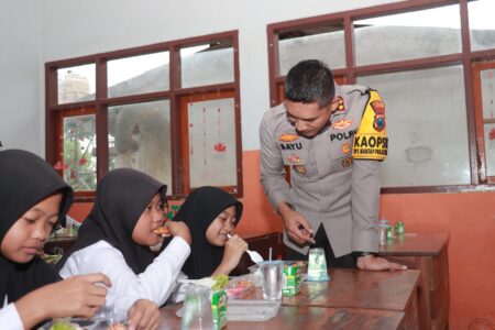Dalam kesempatan tersebut, AKBP Bayu Pratama Gubunagi turut hadir secara langsung untuk menyerahkan makanan bergizi kepada para siswa.