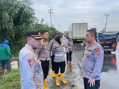Kapolres Pelalawan AKBP Afrizal Asri SIK, melakukan peninjauan di lokasi banjir jalan Lintas Timur kilometer 83. Selasa (21/01/2025)sore, di desa Kemang kecamatan Pangkalan Kuras,peninjauan ini guna memastikan arus lalu lintas berjalan lancar dan memberikan himbau kepada para pengendara.