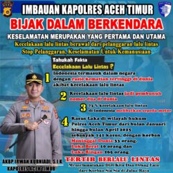Angka kecelakaan lalu lintas (laka lantas) di wilayah hukum Polres Aceh Timur yang tergolong tinggi menjadi perhatian serius oleh Kapolres AKBP Irwan Kurniadi, S.I.K. Hampir setiap hari ada kasus laka lantas. Karenanya, Mantan Kasubdit Regident Ditlantas Polda Aceh akan fokus ke penanganan lalu lintas dan ingin mengajak masyarakat utamanya dalam wilayah hukum Polres Aceh Timur lebih tertib lagi berlalu lintas. Ini demi keselamatan dalam berkendara.