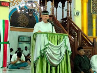 Bupati Aceh Utara Ismail A Jalil, SE, MM, menyampaikan sambutan dalam acara peusijuek (tepung tawar) bagi jamaah calon haji (JCH) Kabupaten Aceh Utara, termasuk para PNS/ASN jajaran Pemerintah Kabupaten Aceh Utara yang akan menunaikan ibadah haji tahun 1446 H/2025 M. Acara berlangsung khidmad di Masjid Agung Baiturrahim, Lhoksukon, pada Rabu, 14 Mei 2025.