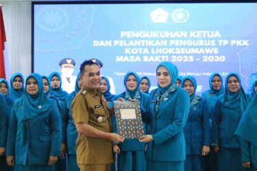 Wali Kota Lhokseumawe, Dr. Sayuti Abubakar, S.H., M.H., secara resmi mengukuhkan Ketua Tim Penggerak Pemberdayaan dan Kesejahteraan Keluarga (TP PKK) Kota Lhokseumawe, Ny. Yulinda Sayuti, serta melantik jajaran pengurus TP PKK Masa Bakti 2025–2030 di Aula Kantor Wali Kota Lhokseumawe, Senin (10/5).