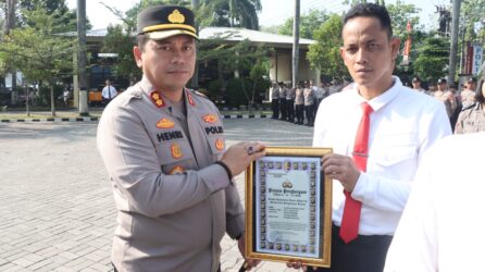 Kapolres Nganjuk, AKBP Henri Noveri Santoso, S.H., S.I.K., M.M., memimpin Apel Jam Pimpinan sekaligus memberikan penghargaan kepada 30 personel Polres Nganjuk yang berprestasi pada Senin (11/8/2025) pagi. Penghargaan ini diberikan kepada anggota yang dinilai mampu melampaui panggilan tugasnya dalam menjaga keamanan dan melayani masyarakat.