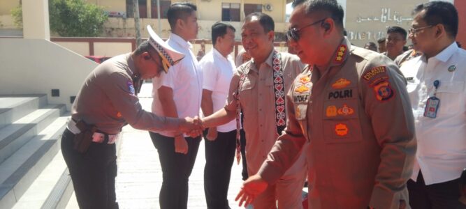 Kapolresta Balikpapan, Kombes Pol Anton Firmanto, S.H., S.I.K., M.Si., menyambut kedatangan rombongan Alumni Akpol 1990 Batalyon Dhira Brata yang menggelar kegiatan bakti sosial di Aula Polresta Balikpapan, Jalan Jenderal Sudirman, Rabu (1/10/2025).