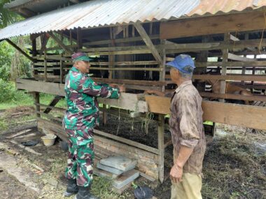 KOPTU Erwinsyah melaksanakan pemantauan Hewan didesa Darul Aman, 3 Oktober 2025 — Pada hari Jumat, 3 Oktober 2025, pukul 09.00 WIB hingga selesai, Koptu Erwinsyah bersama Bapak Agus, selaku pemilik ternak, melaksanakan kegiatan pemantauan penyakit mulut dan kuku (PMK) pada hewan ternak di Desa Darul Aman, Kecamatan Rupat, Kabupaten Bengkalis.