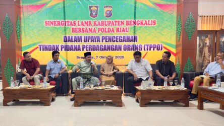 Lembaga Adat Melayu Riau (LAMR) Kabupaten Bengkalis bersama Kepolisian Daerah (Polda) Riau menjalin sinergitas dalam upaya pencegahan Tindak Pidana Perdagangan Orang (TPPO). Kegiatan ini digelar di Aula Gedung LAMR Kabupaten Bengkalis, Jalan Pramuka, Kelurahan Air Putih, Kecamatan Bengkalis, pada Selasa (7/10/2025).