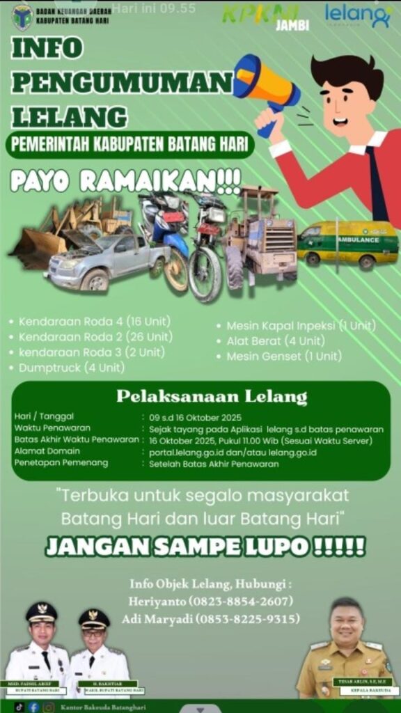 Pemerintah Kabupaten Batang Hari akan melaksanakan kegiatan lelang sejumlah barang milik daerah berupa kendaraan dan alat berat. Kegiatan lelang tersebut dijadwalkan berlangsung pada 9 hingga 16 Oktober 2025.